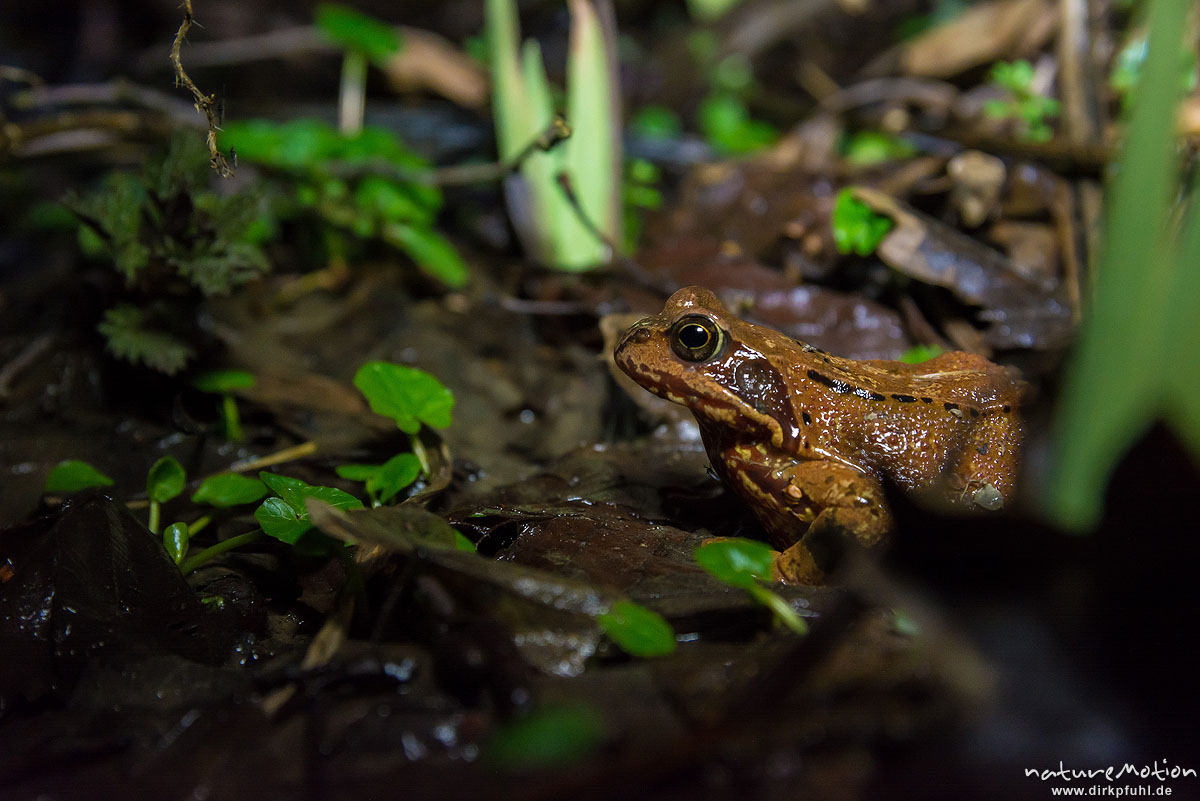 Grasfrosch, Rana temporaria, Echte Frösche (Ranidae), Weibchen auf nächtlicher Wanderung, Erlenbruch, Göttingen, Deutschland