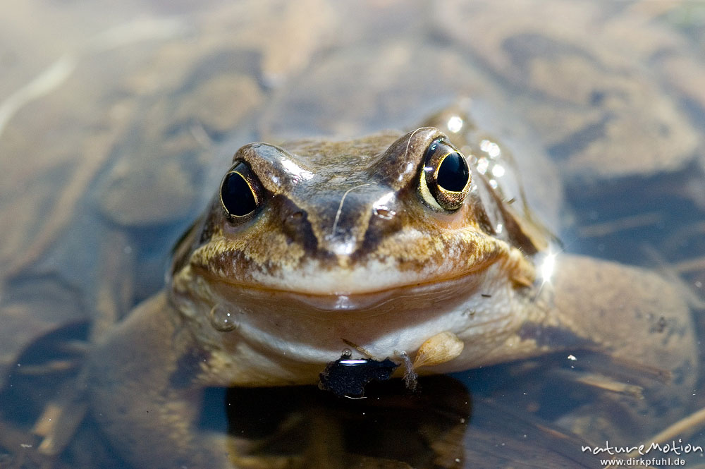 Grasfrosch, Rana temporaria, Ranidae, im Wasser, Portrait von vorn, Erlenbruch beim Tripkenpfuhl Göttingen, Deutschland