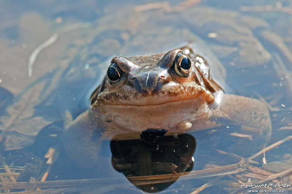 Grasfrosch, Rana temporaria, Ranidae, Männchen in Pfütze neben Waldweg, Göttingen, Deutschland