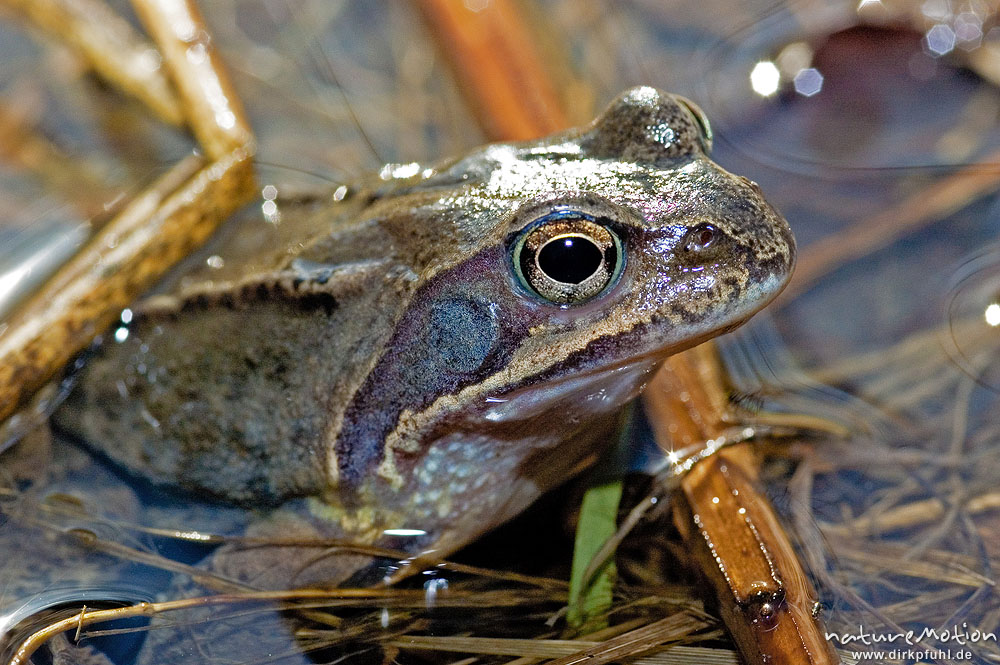 Grasfrosch, Rana temporaria, Ranidae, Männchen in Pfütze neben Waldweg, Göttingen, Deutschland