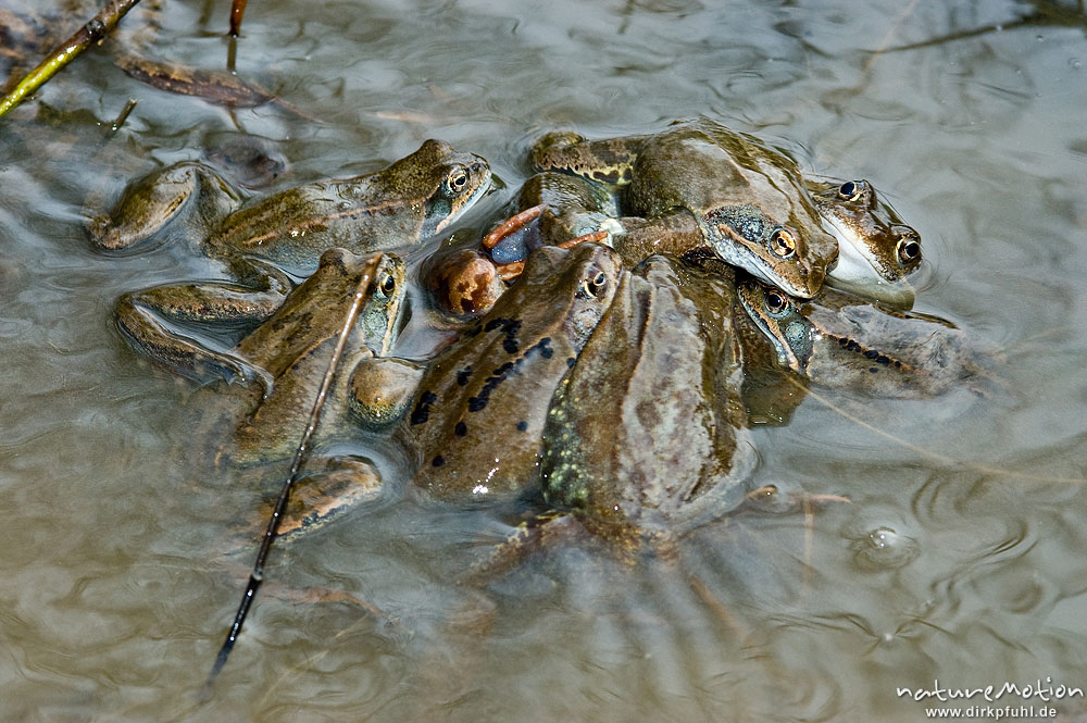 Grasfrosch, Rana temporaria, Ranidae, Männchen, mehrere Männchen versuchen Paarung an totem Tier, Erlenbruch Herberhäuser Stieg, Göttingen, Deutschland