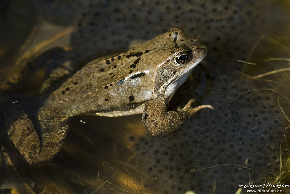 Grasfrosch, Rana temporaria, Ranidae, Tier zwischen Laichballen im Wasser, Erlenbruch Herberhäuser Stieg, Göttingen, Deutschland