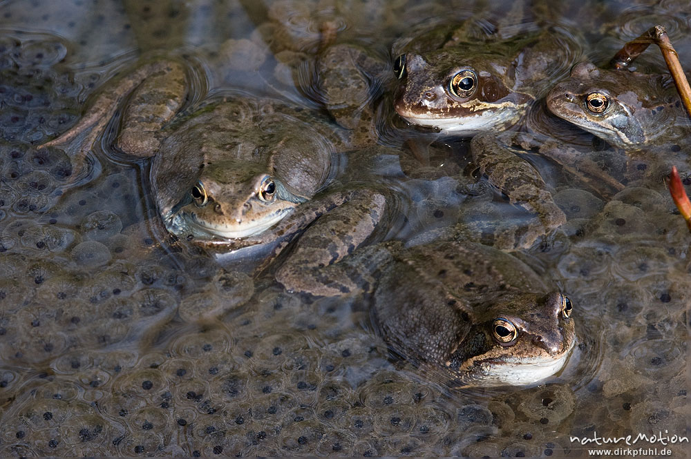 Grasfrosch, Rana temporaria, Ranidae, Tiere inmitten von Laichballen, Erlenbruch Herberhäuser Stieg, Kombination aus zwei Bildern mit unterschiedlicher Schärfeebene, Göttingen, Deutschland