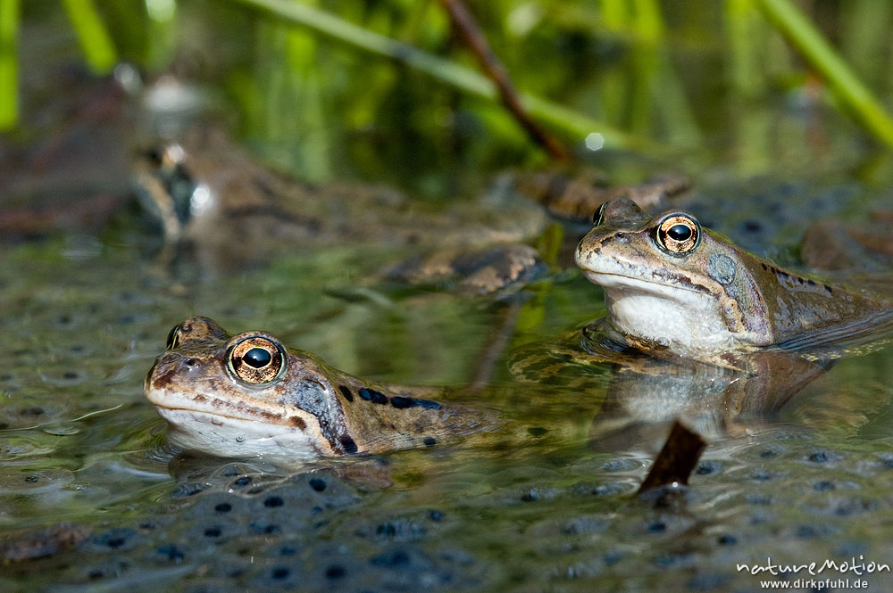 Grasfrosch, Rana temporaria, Ranidae, Tiere inmitten von Laichballen, Erlenbruch Herberhäuser Stieg, Kombination aus zwei Bildern mit unterschiedlicher Schärfeebene, Göttingen, Deutschland