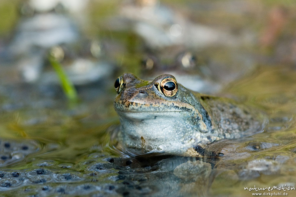 Grasfrosch, Rana temporaria, Ranidae, Tiere inmitten von Laichballen, Erlenbruch Herberhäuser Stieg Göttingen, Deutschland