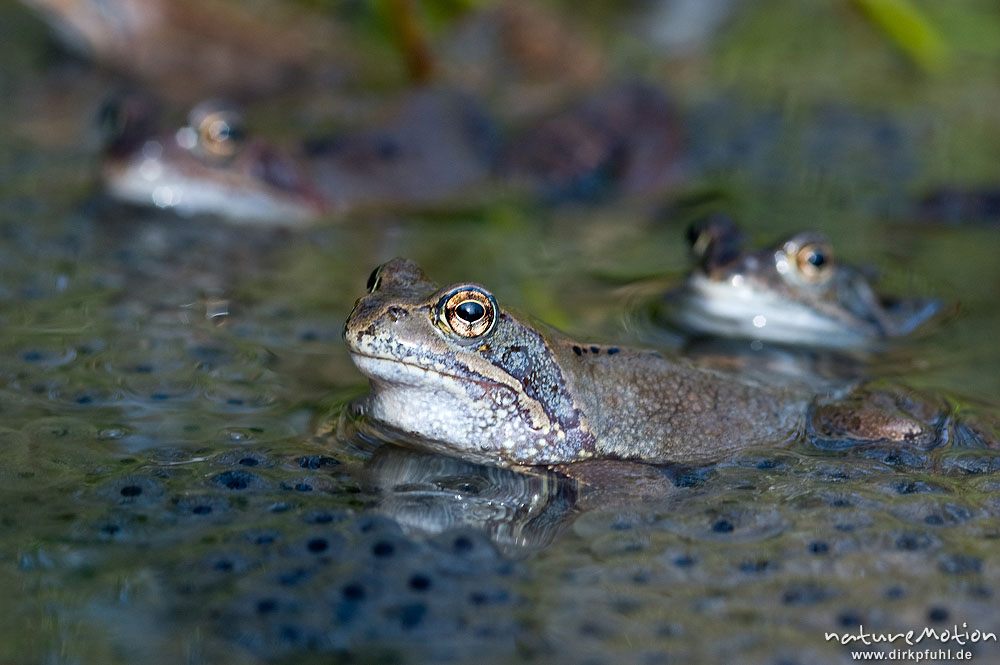 Grasfrosch, Rana temporaria, Ranidae, Tiere inmitten von Laichballen, Erlenbruch Herberhäuser Stieg Göttingen, Deutschland