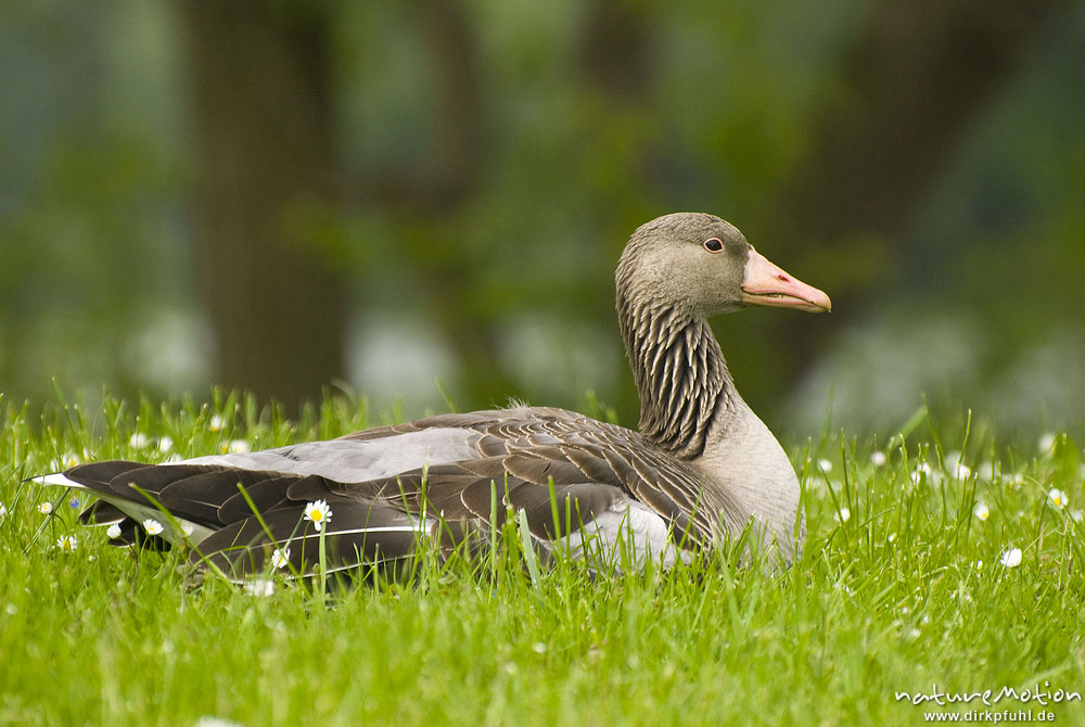 Graugans, Anser anser, Anatidae, Alttier liegt im Gras, Kiessee, A nature document - not arranged nor manipulated, Göttingen, Deutschland