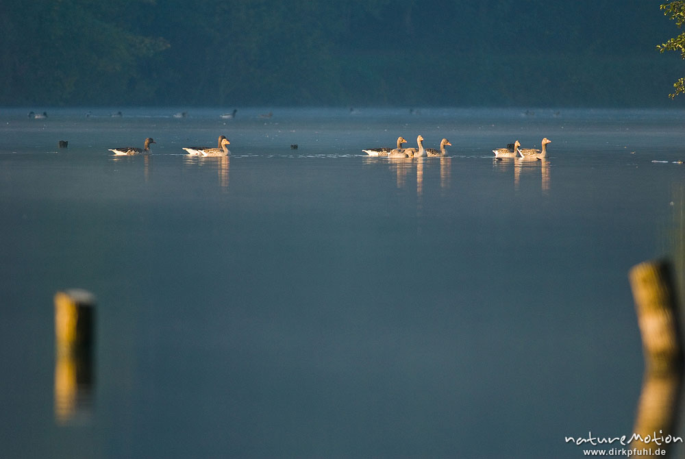 Graugans, Anser anser, Anatidae, Gruppe schwimmt auf See, Morgennebel, A nature document - not arranged nor manipulated, Wendebachstausee bei Göttingen, Deutschland