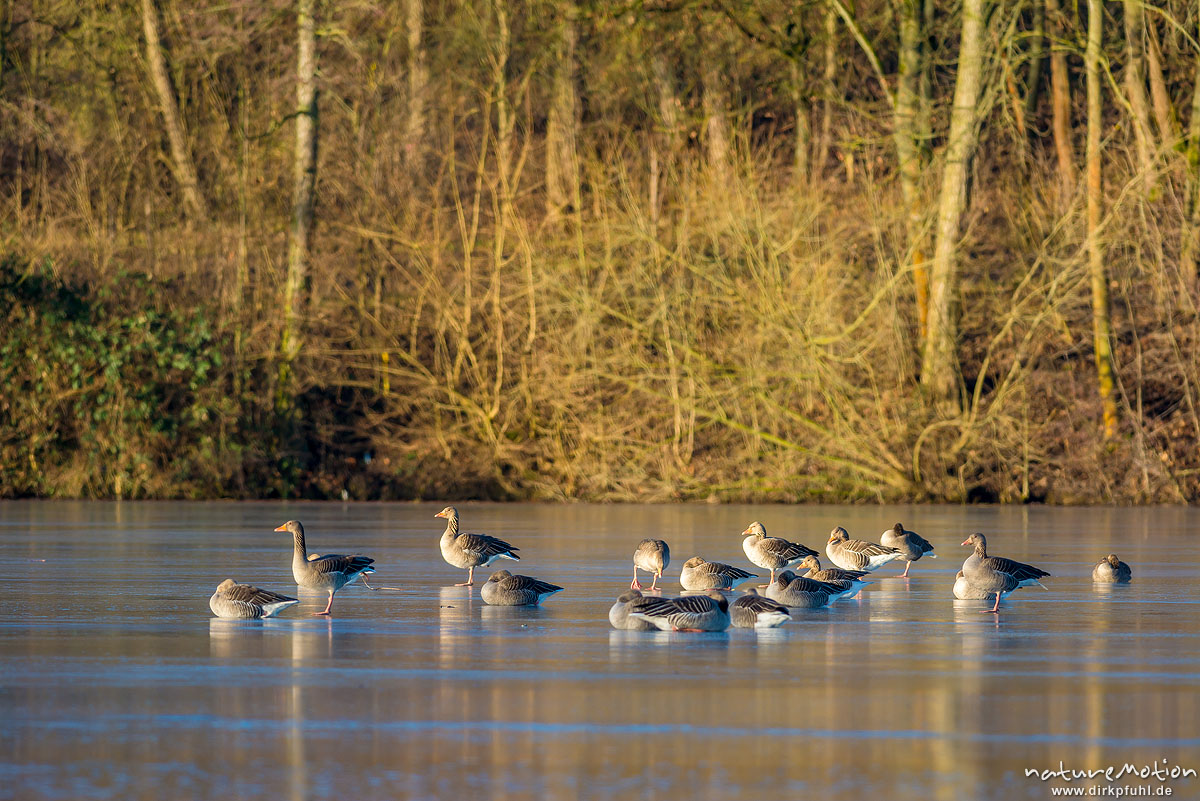 Graugans, Anser anser, Anatidae, Gruppe von Tieren rastet auf dem Eis eines zugefrorenen Sees, Kiessee, Göttingen, Deutschland