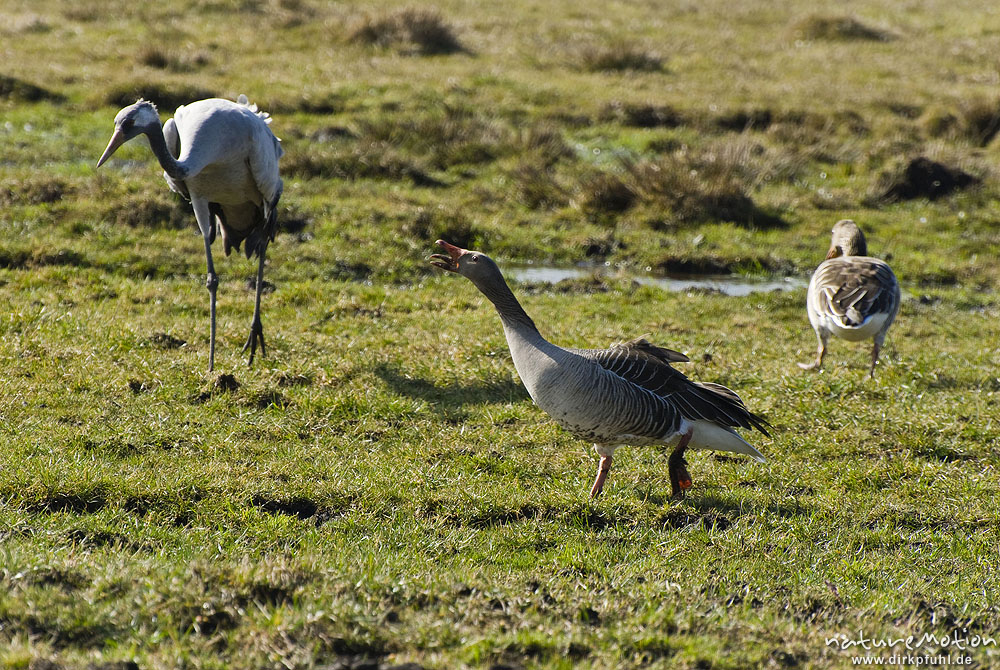 Graugans, Anser anser, Anatidae, Paar beim äsen, Vertreiben weiteres Tier, Günzer Wiesen, wild and c, Groß Mohrdorf, Deutschland
