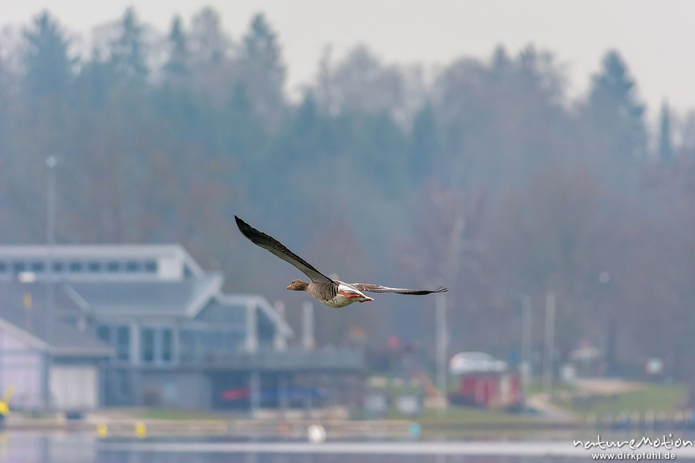 Graugans, Anser anser, Anatidae, Tier fliegt über See, im Hintergrund Bootshäuser, Kiessee, Göttingen, Deutschland
