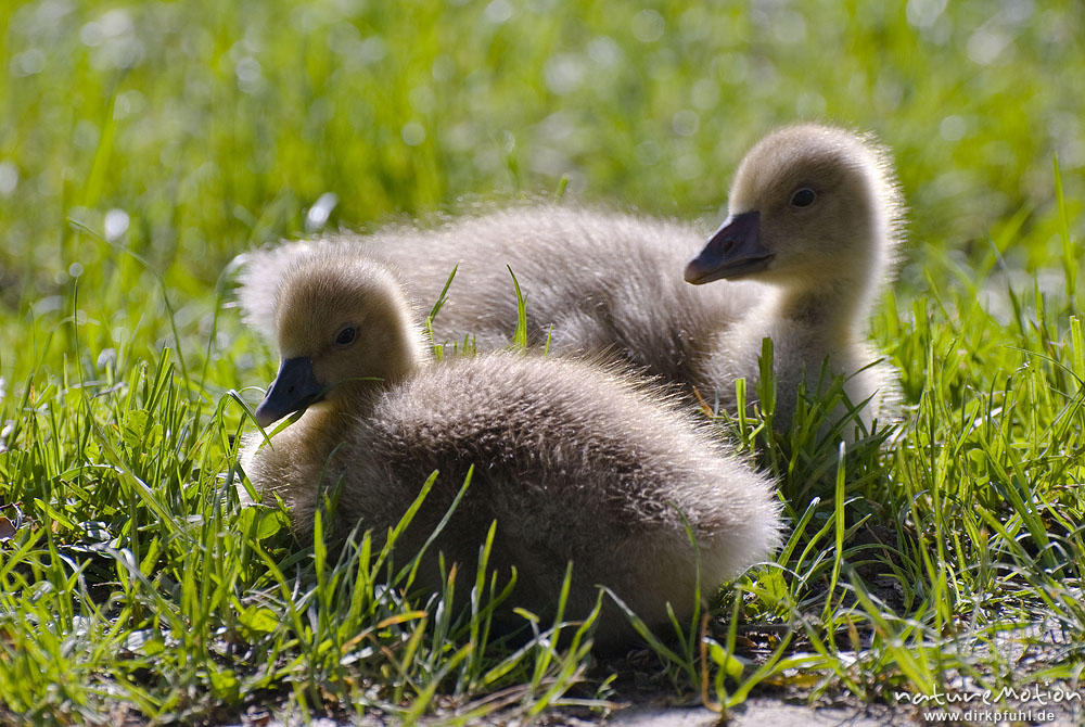Graugans, Anser anser, Anatidae, zwei Küken im Gras, Kiessee, A nature document - not arranged nor manipulated, Göttingen, Deutschland