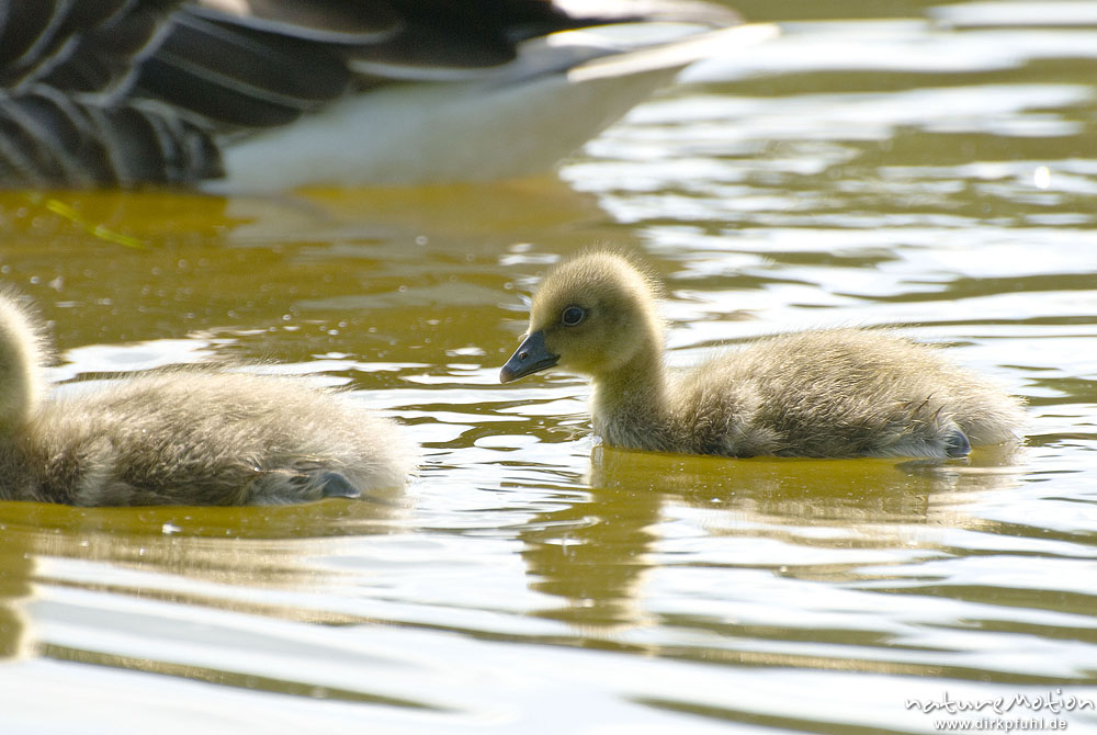 Graugans, Küken, schwimmend im Wasser, Kiessee, A nature document – not arranged nor manipulated, Göttingen, Deutschland