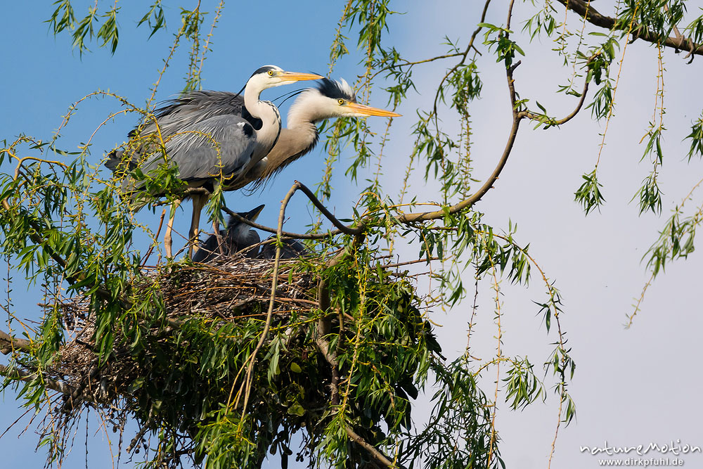 Graureiher, Ardea cinerea, Ardeidae, Brutpaar im Nest, Alttiere und Küken/Jungtiere auf Weide inmitten eines Teiches im Levinschen Park, A nature document - not arranged nor manipulated, Göttingen, Deutschland