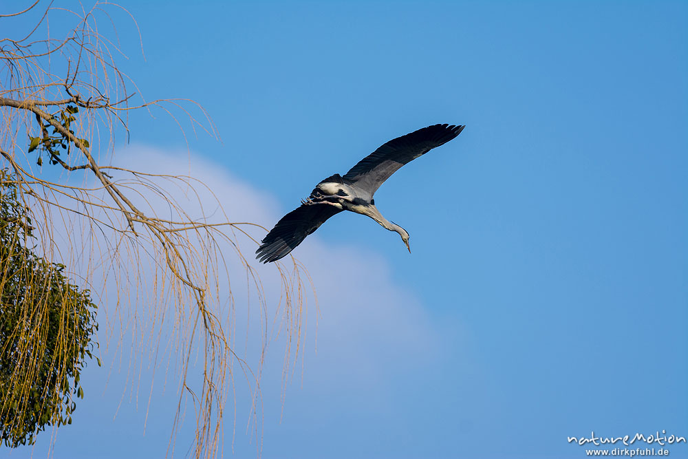 Graureiher, Ardea cinerea, Ardeidae, fliegendes Tier, Brutkolonie, Levinscher Park, A nature documen, Göttingen, Deutschland