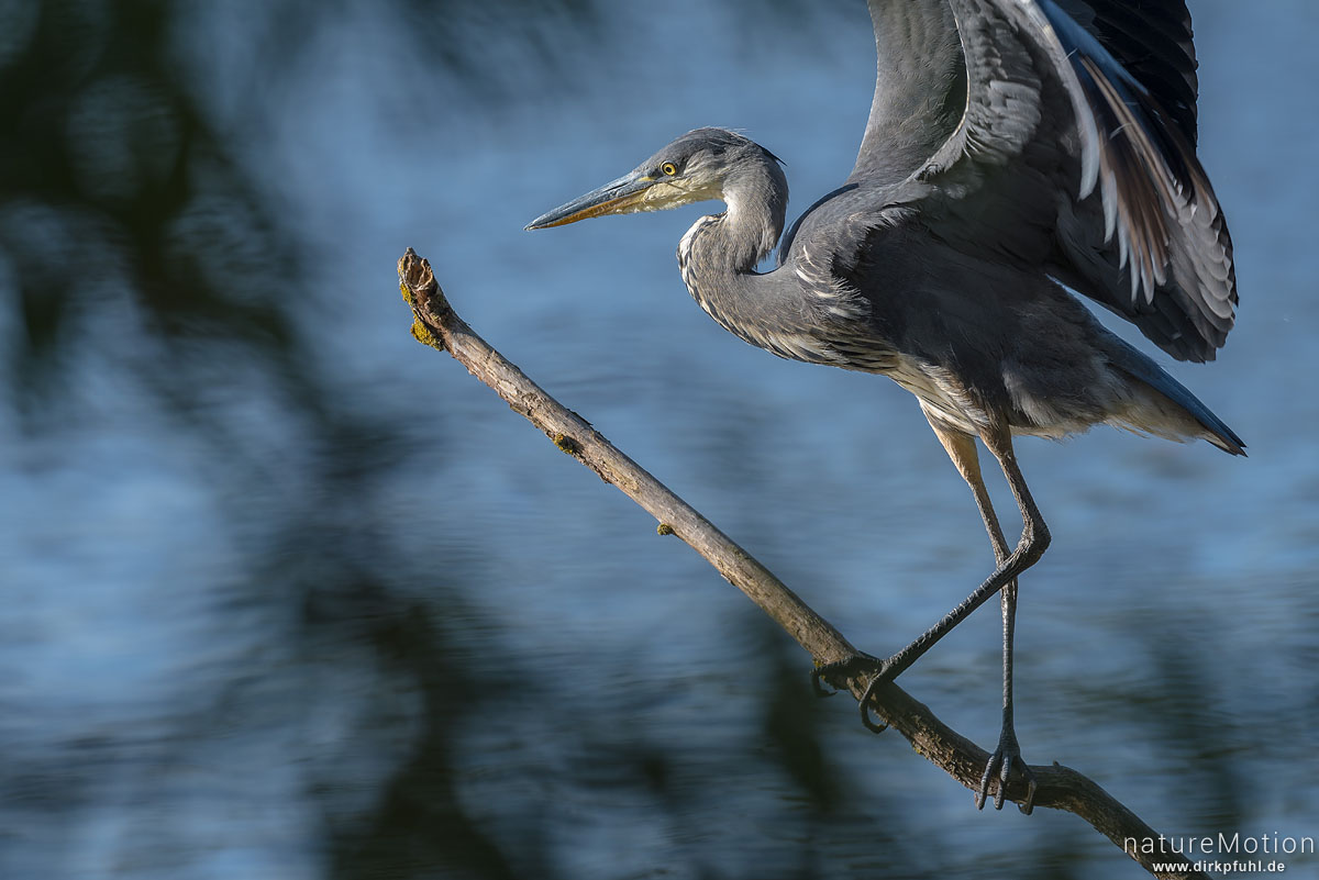 Graureiher, Ardea cinerea, Ardeidae, Jungtier sitzt auf Ast in Ufernähe, Kiessee, Göttingen, Deutschland