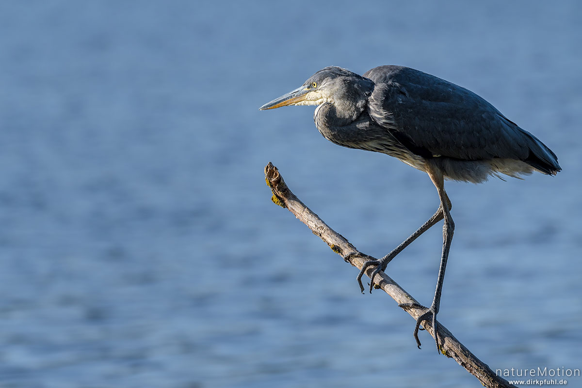 Graureiher, Ardea cinerea, Ardeidae, Jungtier sitzt auf Ast in Ufernähe, Kiessee, Göttingen, Deutschland