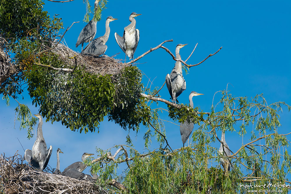 Graureiher, Ardea cinerea, Ardeidae, Jungtiere im Nest, Sonnebad mit halb ausgebreiteten Schwingen, kleine Brutkolonie in einer Weide inmitten eines Teiches, Levinscher Park, A nature document - not arranged nor manipulated, Göttingen, Deutschland