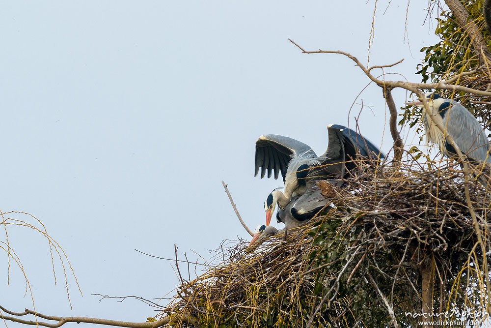 Graureiher, Ardea cinerea, Ardeidae, Paarung, Brutkolonie im Levinschen Park, A nature document - not arranged nor manipulated, Göttingen, Deutschland