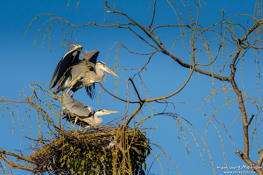 Graureiher, Ardea cinerea, Ardeidae, Paarung, Weide auf Insel im Teich, Levinscher Park, A nature do, Göttingen, Deutschland
