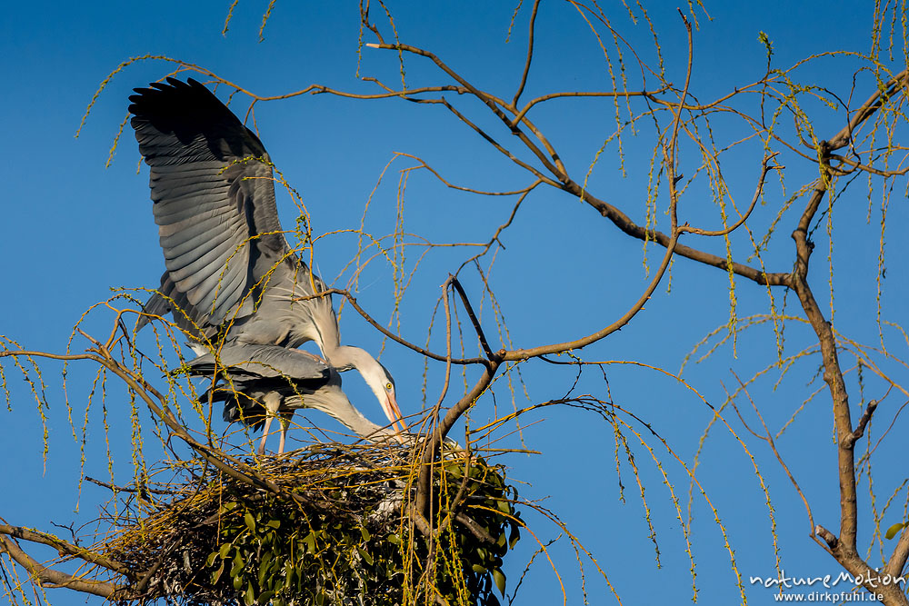 Graureiher, Ardea cinerea, Ardeidae, Paarung, Weide auf Insel im Teich, Levinscher Park, A nature do, Göttingen, Deutschland
