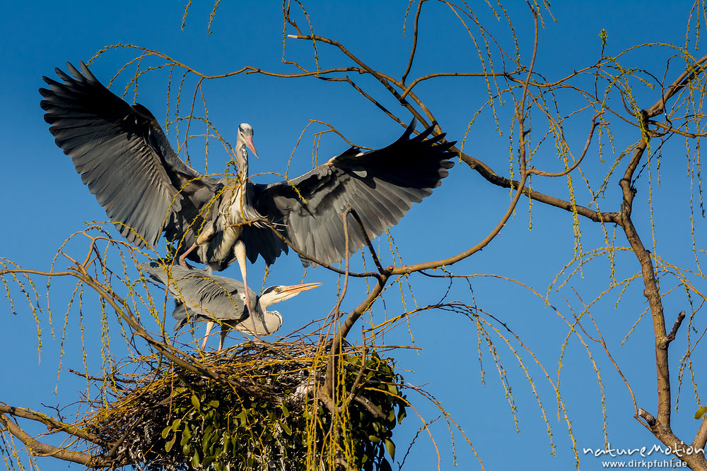 Graureiher, Ardea cinerea, Ardeidae, Paarung, Weide auf Insel im Teich, Levinscher Park, A nature do, Göttingen, Deutschland