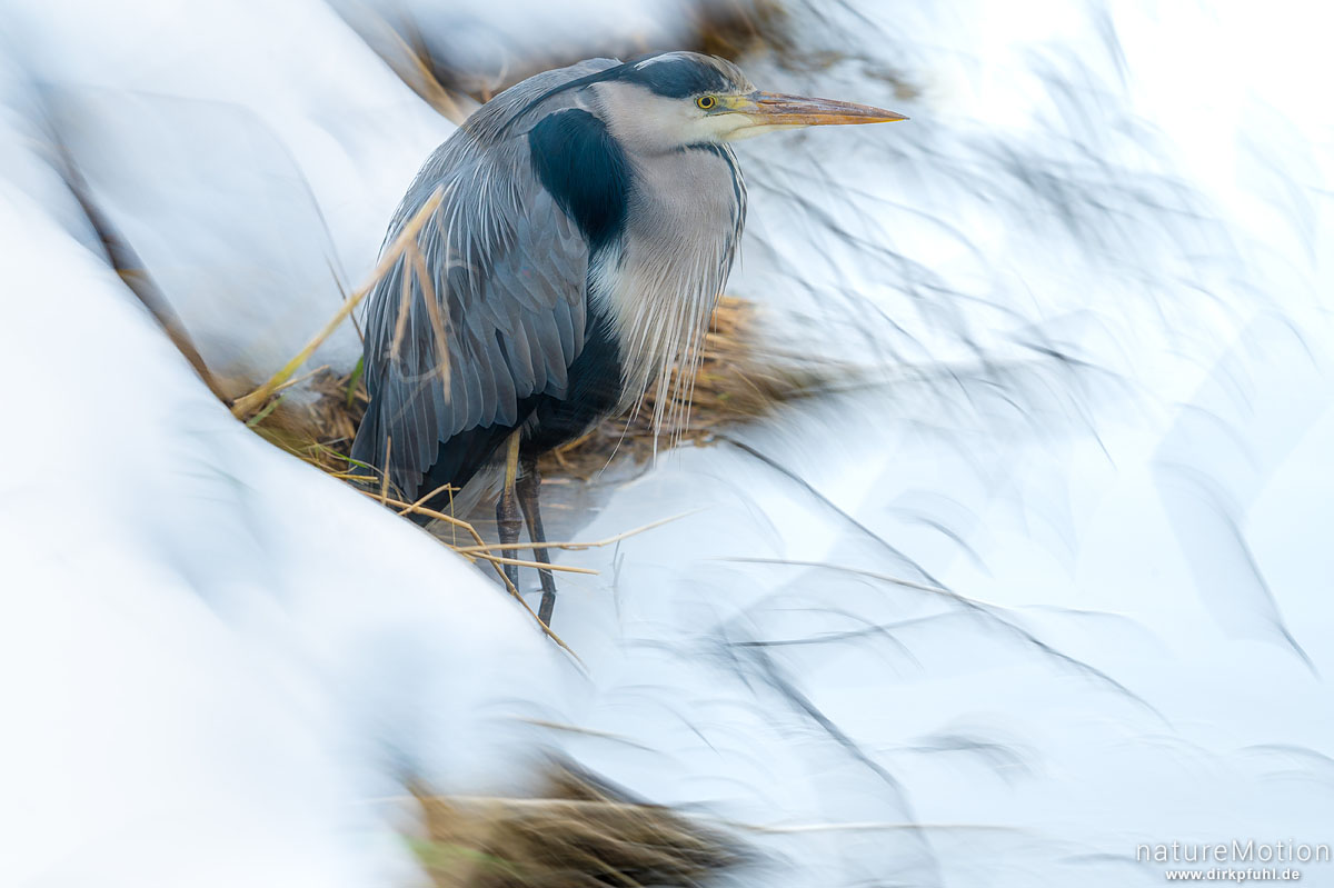Graureiher, Ardea cinerea, Ardeidae, sitzt geduckt am schneebedeckten Ufer, Flüthegraben, Göttingen, Deutschland