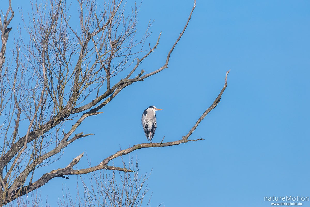 Graureiher, Ardea cinerea, Ardeidae, Tier sitzt auf Ast am Ufer, Seeburger See, Deutschland