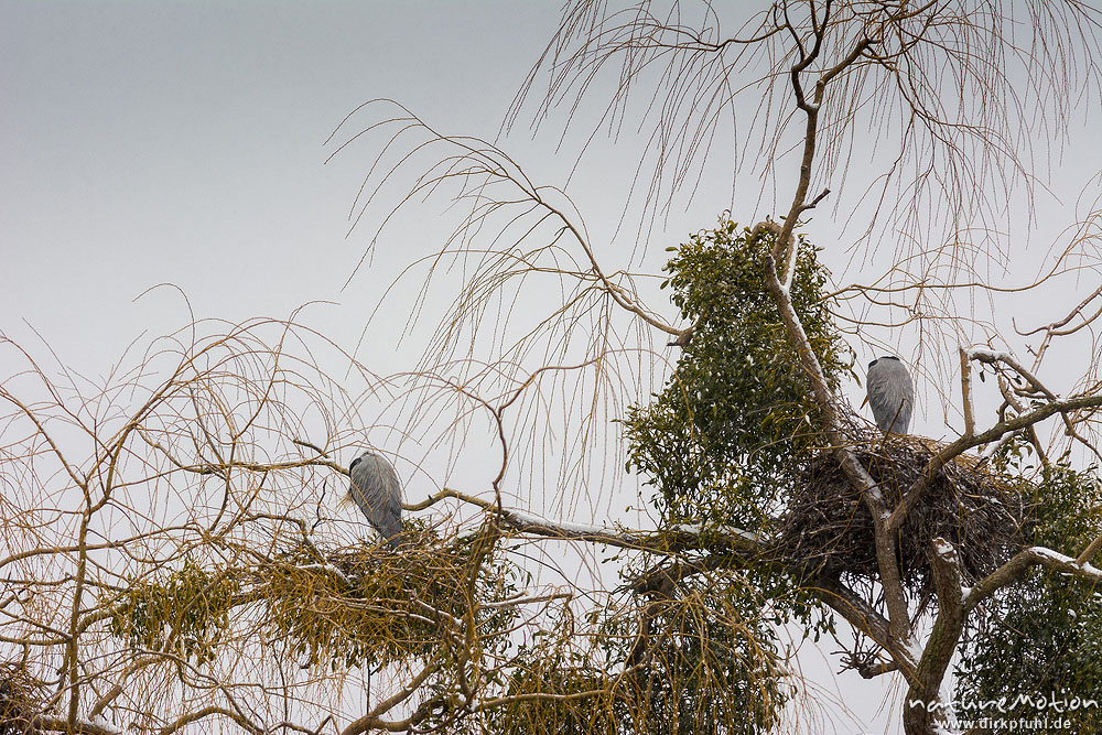 Graureiher, Ardea cinerea, Ardeidae, Tiere besetzen Nester im Brutbaum, Schneetreiben, Levinscher Park, A nature document - not arranged nor manipulated, Göttingen, Deutschland