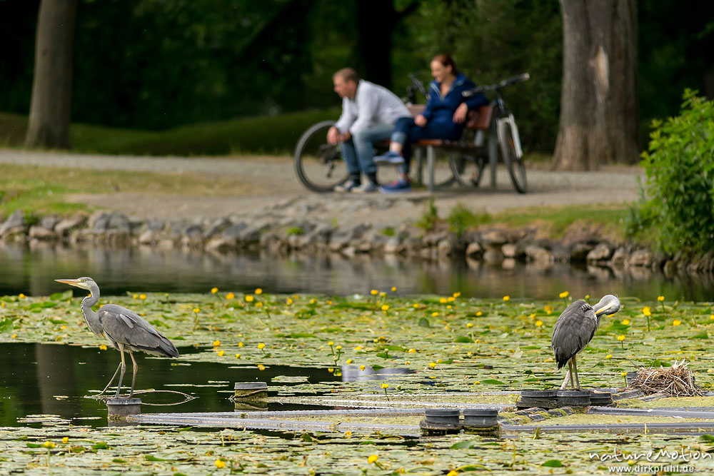 Graureiher, Ardea cinerea, Ardeidae, zwei Jungtiere auf Metallkonstruktion im Brutgewässer, nah am Ufer, Spaziergänger auf Parkbank, Levinscher Park, Göttingen, Deutschland