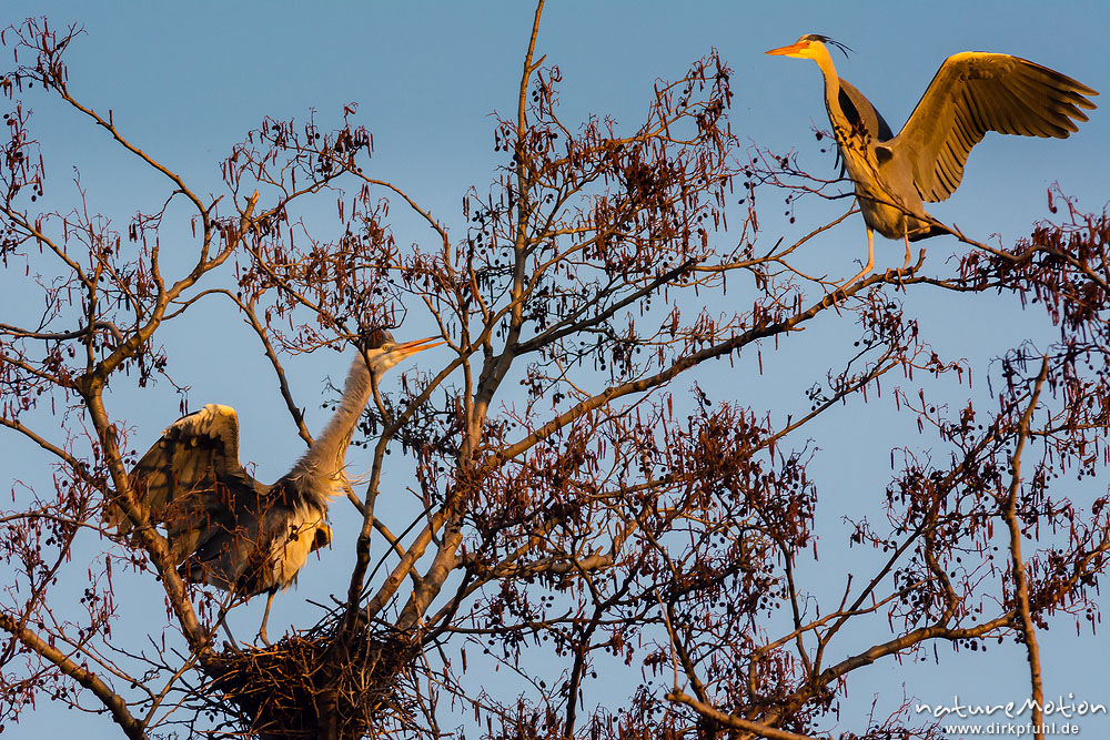 Graureiher, Ardea cinerea, Ardeidae, zwei Tiere streiten sich um Nistmaterial aus einem alten Nest, Levinscher Park, A nature document - not arranged nor manipulated, Göttingen, Deutschland