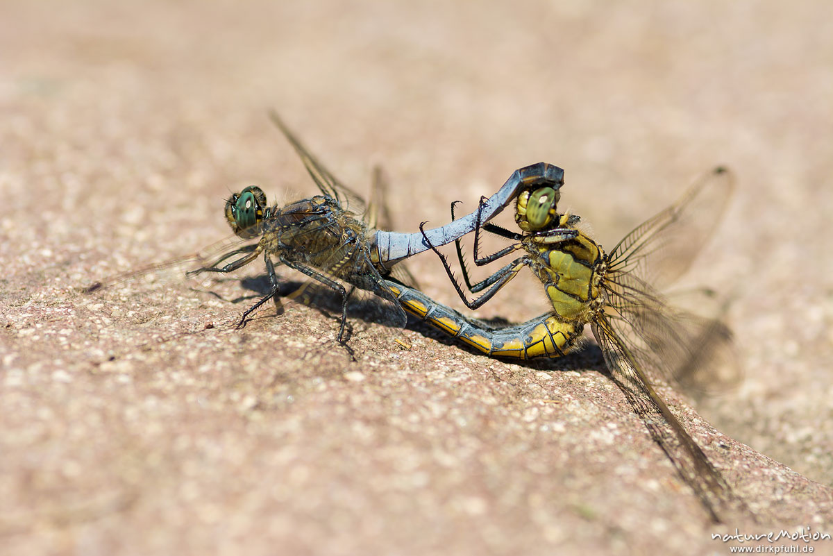 Großer Blaupfeil, Orthetrum cancellatum, Libellulidae, Paarung, Weibchen älter, zeigt blaue Bereifung, Völser Weiher, Völs am Schlern, Südtirol, Italien