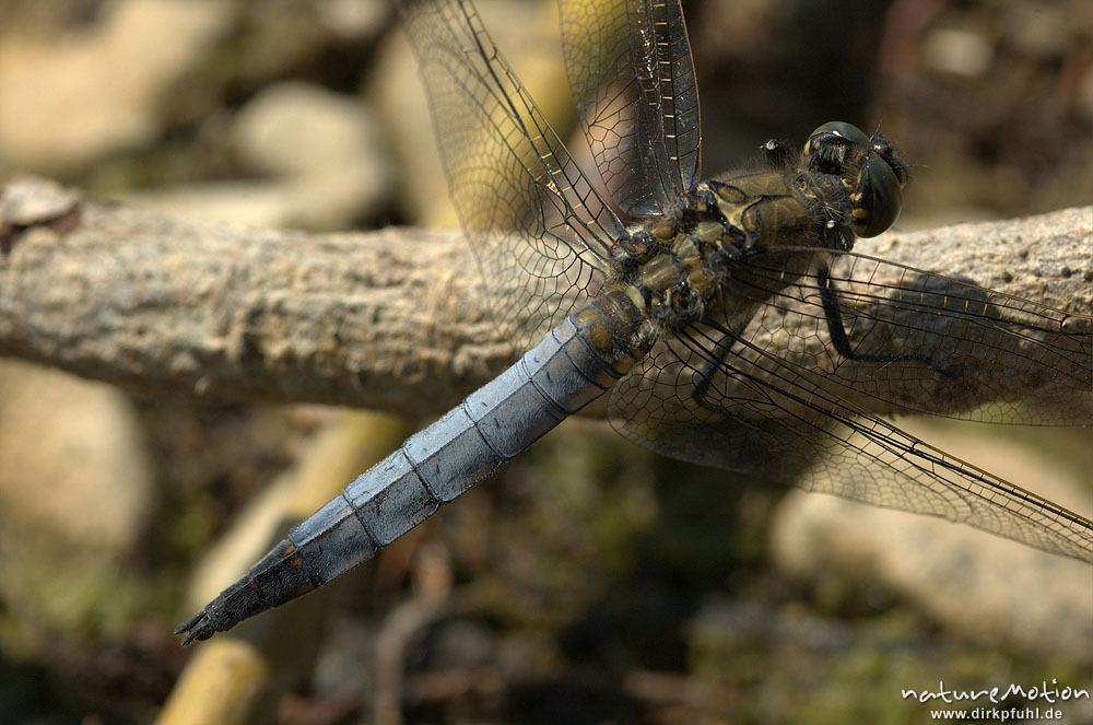 Großer Blaupfeil, Orthetrum cancellatum, Männchen, auf Ast sitzend, sonnend, Baggersee Göttingen, Deutschland