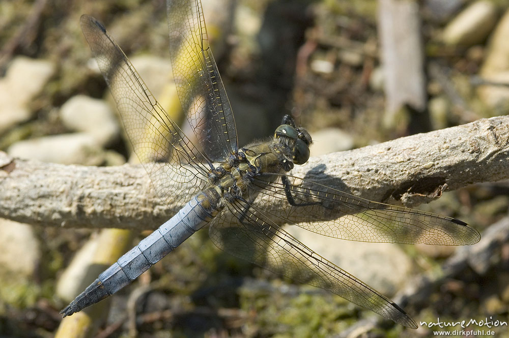 Großer Blaupfeil, Orthetrum cancellatum, Männchen, auf Ast sitzend, sonnend, Baggersee, Göttingen, Deutschland