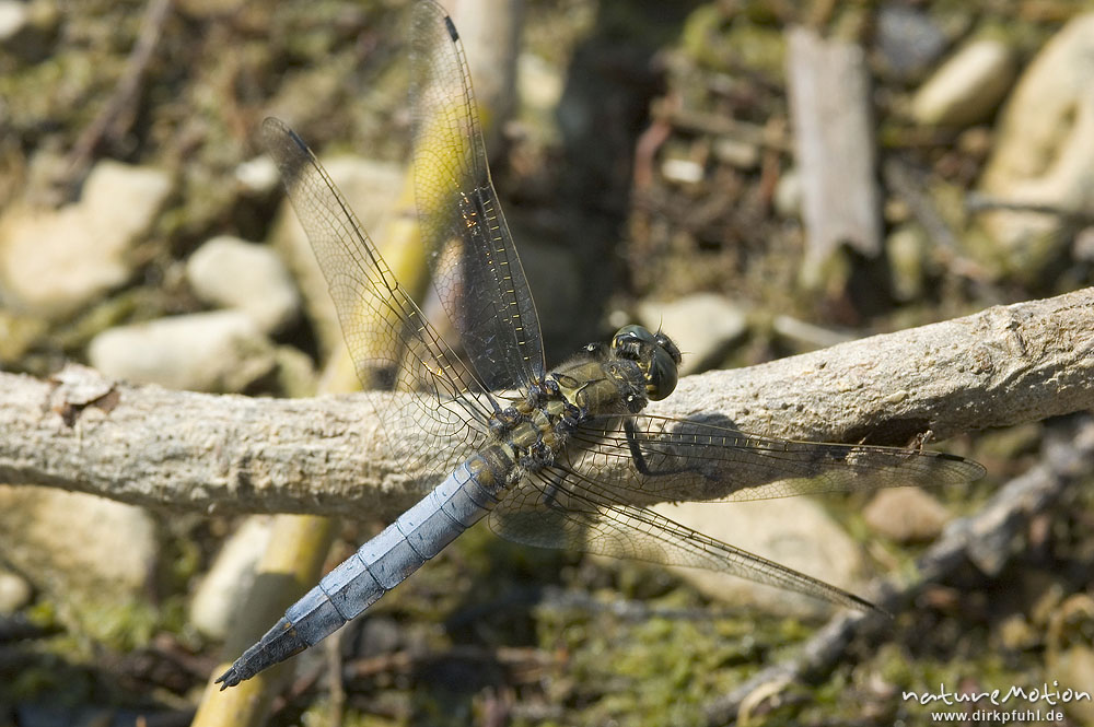 Großer Blaupfeil, Orthetrum cancellatum, Männchen, auf Ast sitzend, sonnend, Baggersee, Göttingen, Deutschland