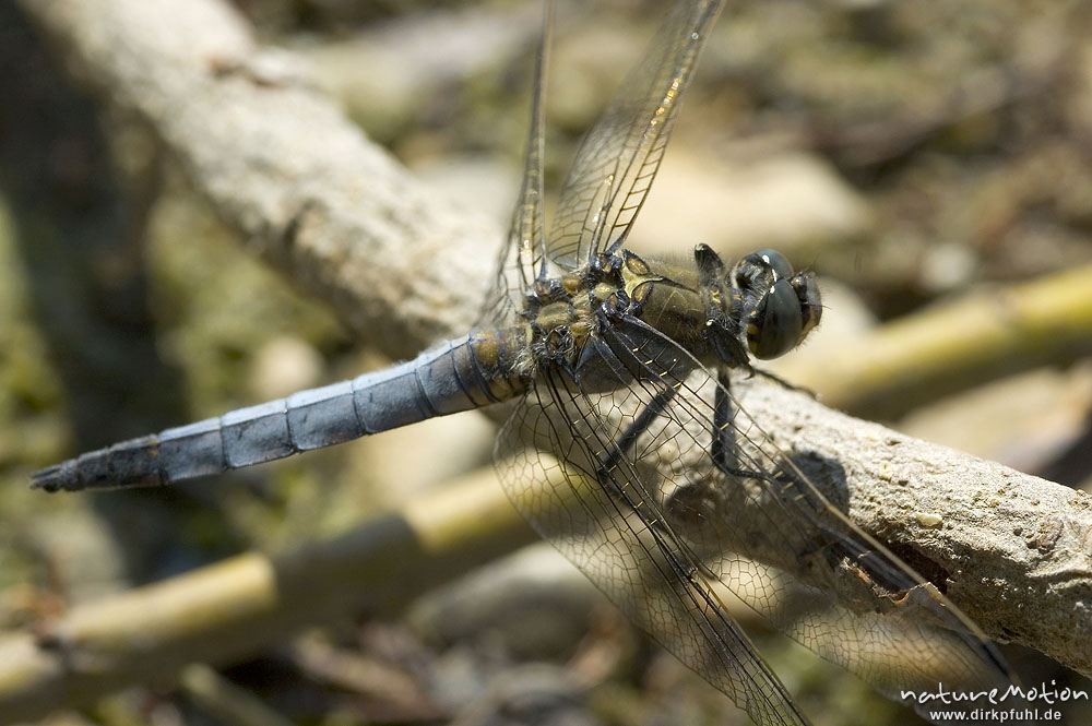 Großer Blaupfeil, Orthetrum cancellatum, Männchen, auf Ast sitzend, sonnend, Baggersee, Göttingen, Deutschland