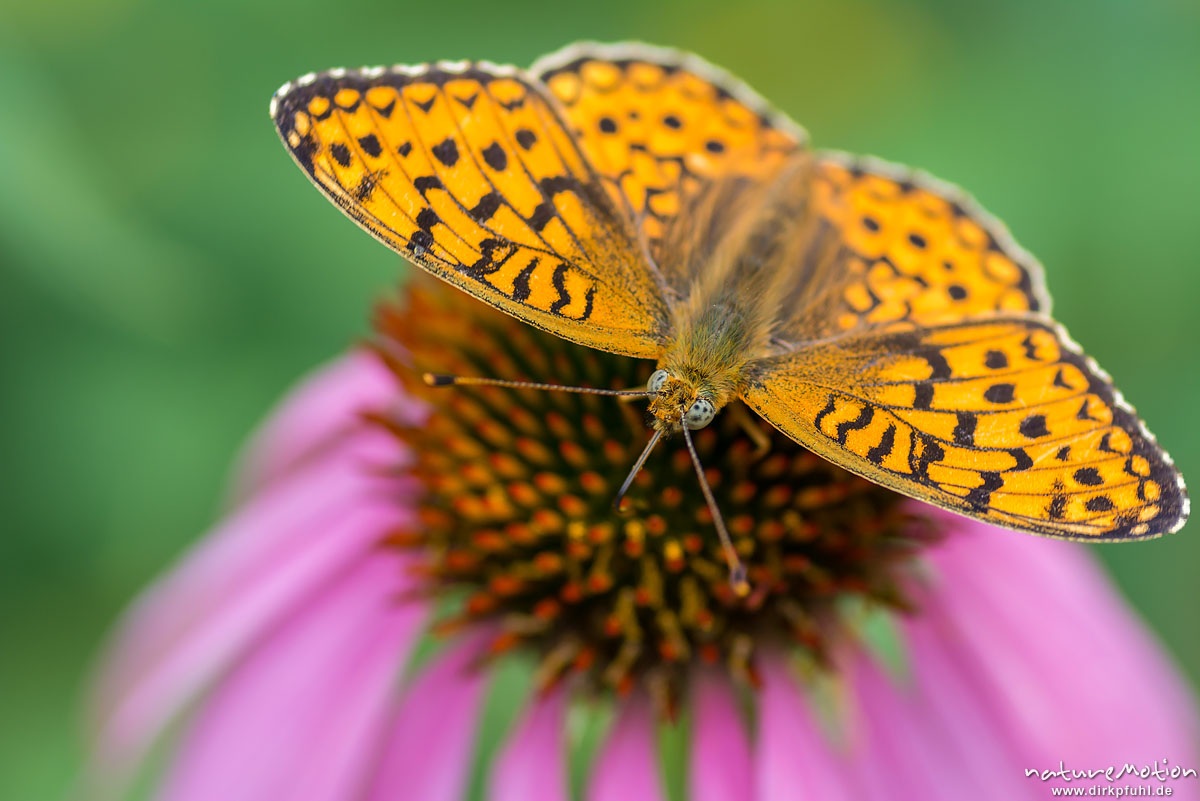 Großer Perlmuttfalter, Argynnis aglaja, Edelfalter (Nymphalidae), (?), Tier saugt Nektar an Blüte, Garten, Ferme de Saliéges, Florac, Frankreich