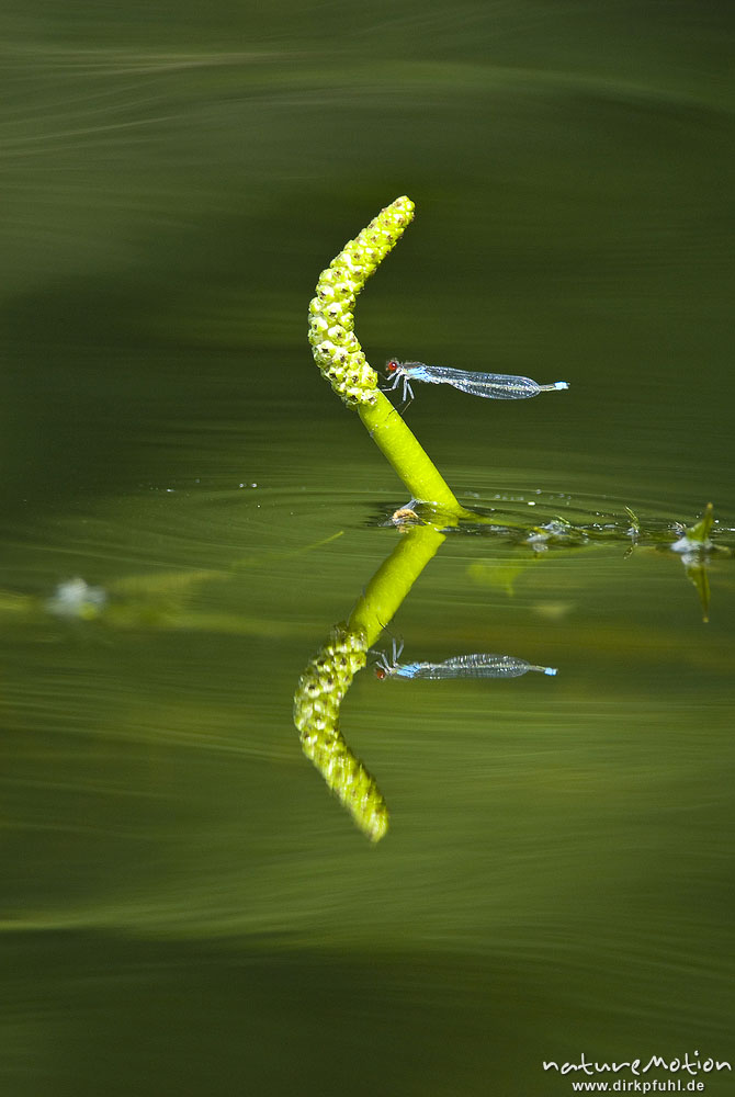 Großes Granatauge, Erythromma najas, Schlanklibellen (Coenagrionidae), Männchen sitzt an Wasserpflanze, Hintergrund unscharfe Wellenzeichnung, Spiegelung, Granziner See, A nature document - not arranged nor manipulated, Granzin, Deutschland