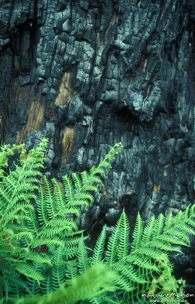 grüne Farnwedel vor verkohltem Baumstumpf, Tavignano-Tal, Korsika, Frankreich