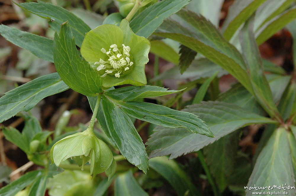 Grüne Nieswurz, Helleborus viridis, Blüten und Laubblätter, Wald bei Ossenfeld Ossenfeld (Göttingen), Deutschland