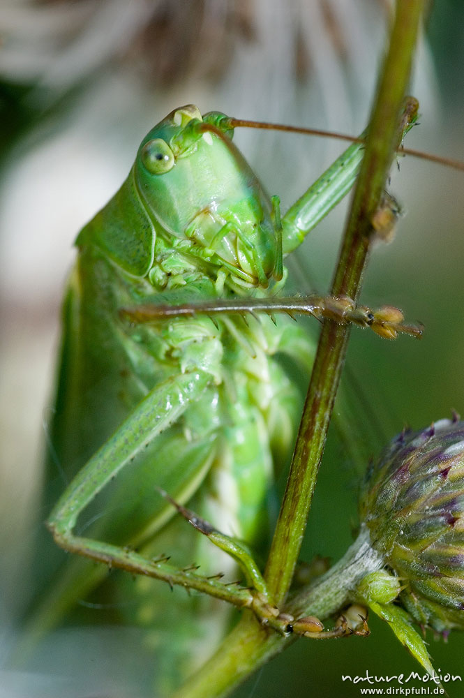 Grünes Heupferd, Tettigonia viridissima, Tettigoniidae, Männchen an Distel, Kopf mit Mundwerkzeugen, Kerstlingeröder Feld, Kombination aus zwei Bildern mit unterschiedlicher Schärfeebene, Göttingen, Deutschland