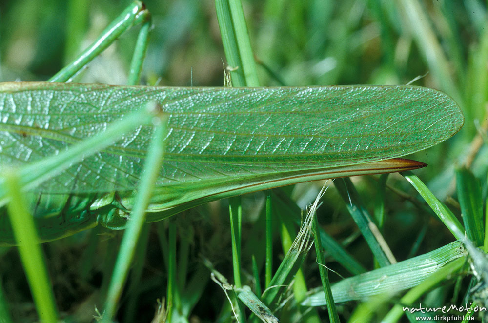 Grünes Heupferd Weibchen, Tettigonia viridissima, Heupferde im Gras, seitlich, Detailansicht Legeröhre, Göttingen, Deutschland
