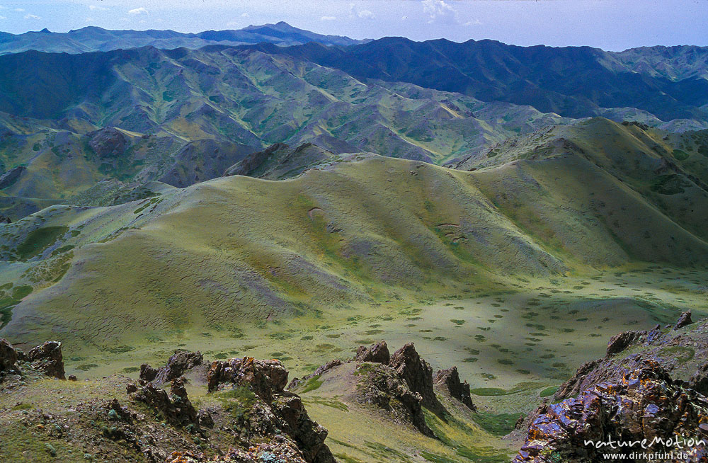 Gurwan Saichan Berge nahe Jolyn Am Schlucht (Geier-Schlucht), gerippelte, grünbewachsene Bergrücken, Erosion, Wüste Gobi, Mongolei