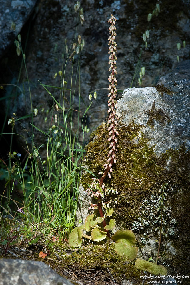 Hängendes Nabelkraut, Venusnabel, Umbilicus rupestris, Dickblattgewächse (Crassulaceae), mit felsen durchsetzter Kiefernwald, Restonica-Tal, Korsika, Frankreich