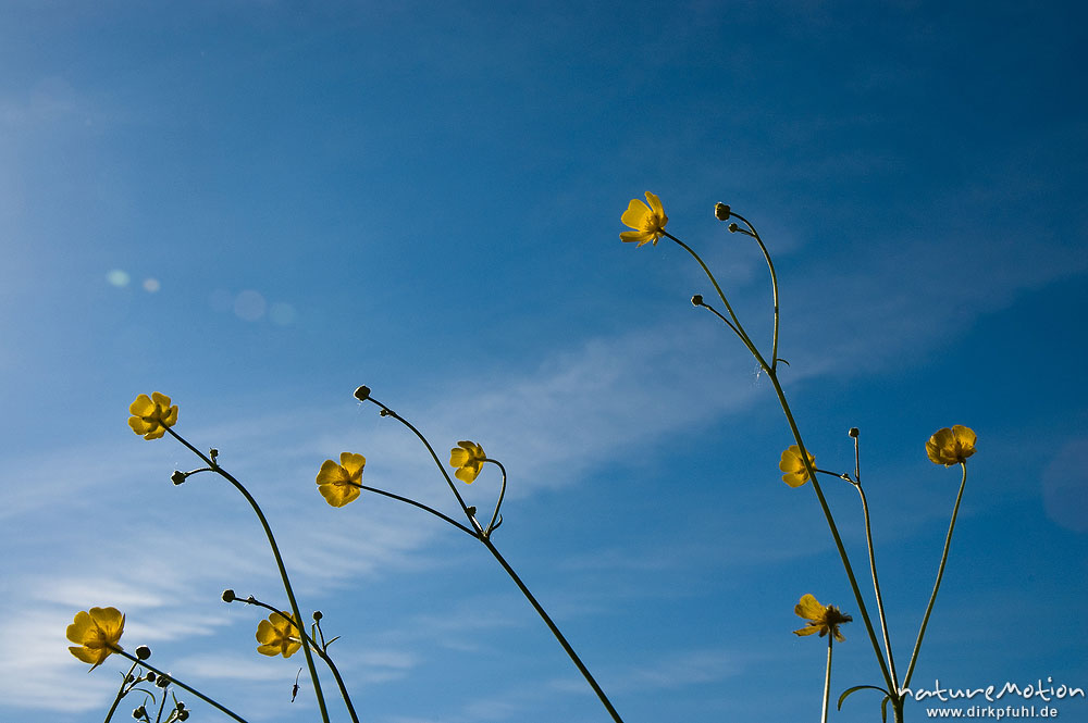 Hahnenfuß, Ranunculus spec., Ranunculaceae, Blüten gegen blauen Himmel, Göttingen, Deutschland