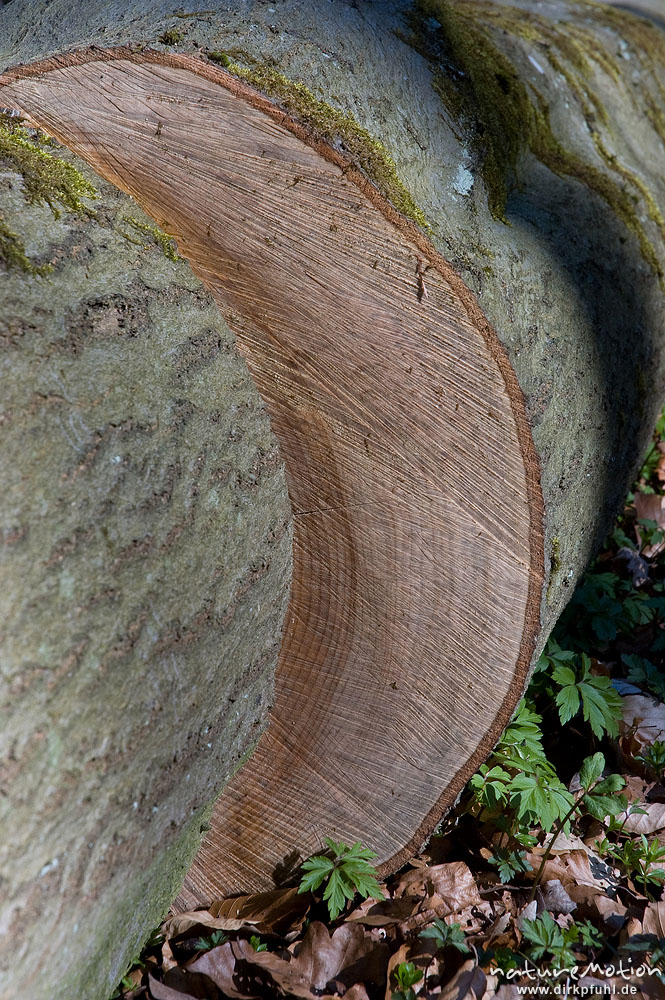 Hainbuche, Carpinus betulus, Betulaceae, Schnittkante eines frisch zersägten Stammes, Settmarshausen bei Göttingen, Deutschland