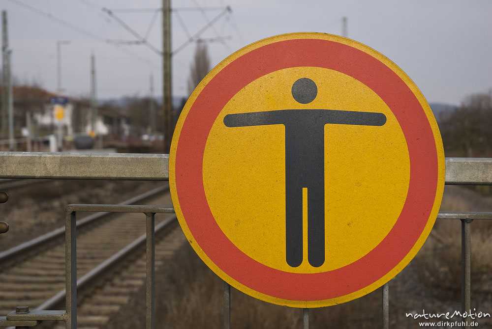 Halteschild, Bahnsteig Ende, Schild am Bahnsteig, Bahnhof Friedland Friedland, Deutschland