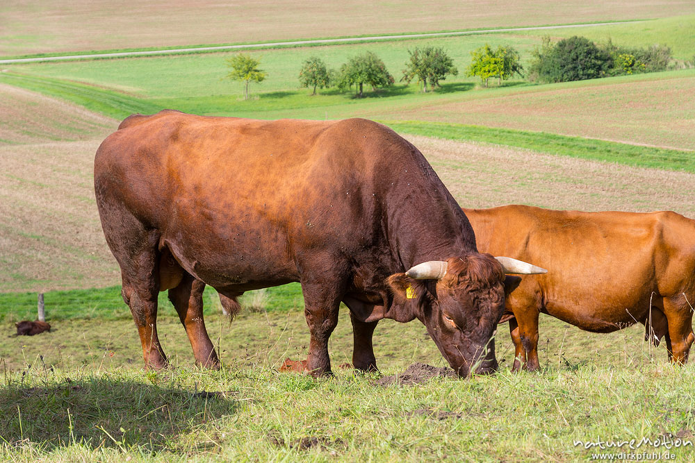 Harzer Rotvieh, Hausrind, Bos taurus, Bovidae, weidende Tiere, Naturschutzgebiet Gipskastlandschaft bei Hattorf, Harz, Hattorf am Harz, Deutschland