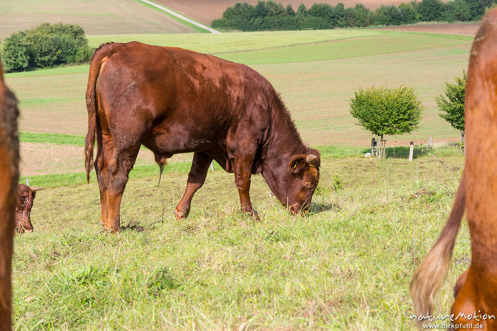 Harzer Rotvieh, Hausrind, Bos taurus, Bovidae, weidende Tiere, Naturschutzgebiet Gipskastlandschaft bei Hattorf, Harz, Hattorf am Harz, Deutschland