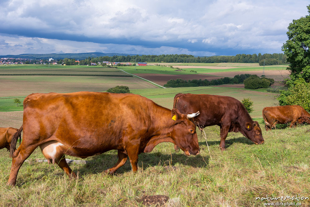 Harzer Rotvieh, Hausrind, Bos taurus, Bovidae, weidende Tiere, Naturschutzgebiet Gipskastlandschaft bei Hattorf, Harz, Hattorf am Harz, Deutschland